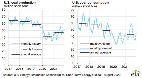 8月11日,美國能源信息署(EIA)發(fā)布8月份《短期能源展望》顯示,2020年,美國煤炭產(chǎn)量預(yù)計(jì)為5.022億短噸(4.56億噸),較7月份預(yù)期增加約100萬短噸,較2019年實(shí)際產(chǎn)量7.05億短噸下降28.8%。 《短期能源展望》顯示,這一預(yù)估產(chǎn)量將創(chuàng)1963年的4.77億短噸以來新低。2021年,美國煤炭產(chǎn)量預(yù)計(jì)將回升至5.64億短噸。 能源信息署表示,自今年年初以來,新冠肺炎疫情爆發(fā)導(dǎo)致電力需求低迷、煤礦減產(chǎn),該機(jī)構(gòu)已將美國2020年煤炭產(chǎn)量預(yù)期較最初值下調(diào)9440萬短噸。