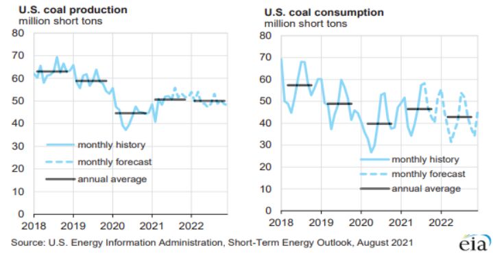 8月10日,美國(guó)能源信息署(EIA)發(fā)布最新《短期能源展望》報(bào)告顯示,2021年,美國(guó)煤炭產(chǎn)量預(yù)計(jì)為6.07億短噸(5.5億噸),同比增長(zhǎng)13%,較前一月預(yù)期值減少1000萬(wàn)短噸。 報(bào)告顯示,2022年,美國(guó)煤炭產(chǎn)量預(yù)計(jì)為6億短噸,較2021年預(yù)期值下降1.15%。