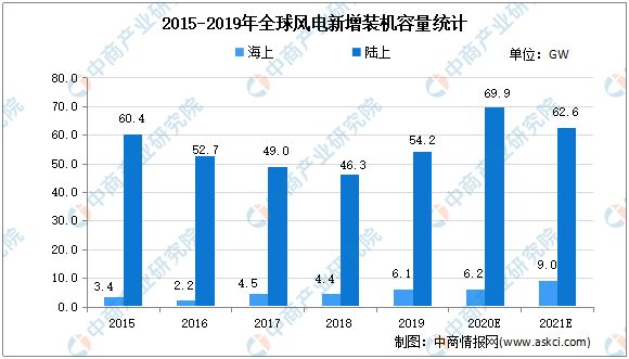 近年來,世界各國對能源安全、生態(tài)環(huán)境、氣候變化等問題的日益重視,加快發(fā)展風電產(chǎn)業(yè)已成為國際社會推動能源轉(zhuǎn)型發(fā)展、應對全球氣候變化的普遍共識和一致行動。數(shù)據(jù)顯示,2019年全球風電新增裝機容量60.4吉瓦,同比增長19.13%。其中,陸上風電新增裝機容量54.2吉瓦,同比增長17.06%,海上風電新增裝機容量6.1吉瓦,同比增長38.64%。未來五年,全球風電行業(yè)將延續(xù)發(fā)展趨勢,風電新增裝機容量可達355吉瓦,年均復合增長率將達到4%,海上風電裝機容量將持續(xù)快速增長。