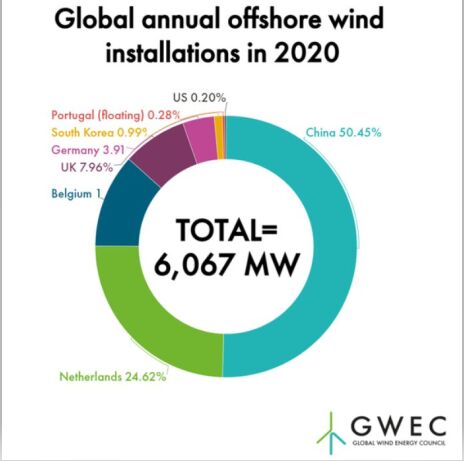 據(jù)全球風能理事會GWEC(Globle Wind Energy,GWEC)最新報告,2020年,全球新增海上風電裝機容量的一半來自中國。 絲路中心(BRICC)觀察到,海上風電已是全球能源投資的熱點產(chǎn)業(yè)。目前海上風電發(fā)展目前是什么態(tài)勢?全球資源情況如何?今后將如何發(fā)展?我們應該采取什么策略? 本篇文章,絲路中心(BRICC)根據(jù)公開資料對以上問題進行分析,并提出相應的工作建議。 文章要點 •全球海上風電發(fā)展呈現(xiàn)進入爆發(fā)期。后續(xù)還會有越來越多的國家出臺支持政策,發(fā)展還將加快。中國連續(xù)三年海上風電新增裝機量處于世界領先地位,2020年新增海上風電裝機量超過3GW,占全球增量一半以上。 •中國近年已經(jīng)成為全球海上風電發(fā)展的領頭羊,今后還將繼續(xù)加大力度。歐洲國家,韓國、越南等亞洲國家也在持續(xù)發(fā)力。 •全球海上風電具有巨大的發(fā)展空間。隨著單機容量不斷增大、制造和安裝成本的持續(xù)下降,海上風電將越來越具備商業(yè)競爭價值。 •在一些海上風電資源豐富的國家,在其政策將明未明之時,及時搶占資源好的風電場并連續(xù)開發(fā),是當前海外電力投資的重要方向。 •未來提高競爭力,海上風電+儲能、海上風電+制氫等模式,也是應該考慮的可持續(xù)發(fā)展模式。 1 中國海上風電行業(yè)進入爆發(fā)期 根據(jù)全球風能理事會(Global Wind Energy Council,GWEC)發(fā)布的最新數(shù)據(jù)顯示,2020年全球海上風電新增裝機量超過6GW,盡管受到新冠疫情影響,但風電發(fā)展在能源行業(yè)中保持良好勢頭,成為有史以來第二好的年份,詳見圖1、表1。 總體而言,目前全球海上風電裝機總?cè)萘恳殉^35GW,在過去5年中增長了106%,詳見圖2、表2。