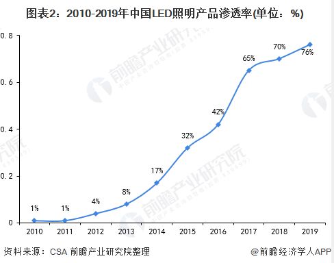 照明產(chǎn)品是國(guó)民經(jīng)濟(jì)發(fā)展和人民生活的必需品,照明行業(yè)在國(guó)民經(jīng)濟(jì)中具有特殊的地位和作用。照明從基于鎢絲燈,氣體放電燈的傳統(tǒng)照明跨入基于半導(dǎo)體器件的LED照明,正好遇到移動(dòng)互聯(lián)網(wǎng)躍進(jìn)到萬(wàn)物互聯(lián)的物聯(lián)網(wǎng)IoT的時(shí)代風(fēng)口,兩者的結(jié)合,開創(chuàng)了前景廣闊的基于物聯(lián)網(wǎng)的智能照明時(shí)代。 平穩(wěn)發(fā)展的LED照明行業(yè)為智能照明打下基礎(chǔ) LED照明技術(shù)是智能照明的基礎(chǔ)。LED燈具有其他燈具無(wú)可比擬的優(yōu)點(diǎn)如體積小、高亮度低熱量、環(huán)保、可控性強(qiáng)等,目前正廣泛應(yīng)用在各照明領(lǐng)域中。2011年11月14日,國(guó)家發(fā)改委等五部委發(fā)布了“中國(guó)逐步淘汰白熾燈路線圖”,計(jì)劃從2016年10月1日開始,禁止進(jìn)口和銷售15瓦及以上普通照明白熾燈。同時(shí),LED照明產(chǎn)品成本不斷下降,其正在逐步替代傳統(tǒng)照明產(chǎn)品,成為家居、商業(yè)、工業(yè)、戶外照明的主力。2019年,中國(guó)LED照明市場(chǎng)規(guī)模達(dá)到6823億元,LED照明產(chǎn)品滲透率達(dá)到76%。
