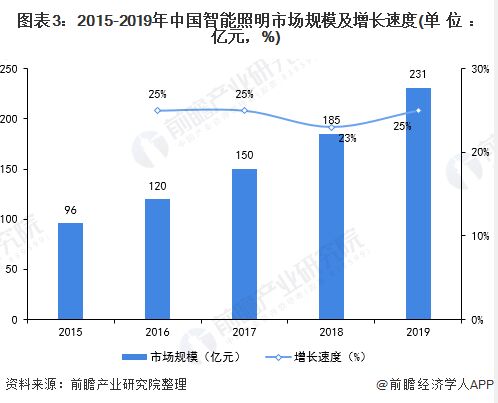 智能照明市場(chǎng)規(guī)模不斷擴(kuò)大 隨著消費(fèi)者對(duì)照明光效、個(gè)性化照明、節(jié)能環(huán)保等要求的提升,智能照明作為最行之有效的解決方案,將成為行業(yè)發(fā)展的必然趨勢(shì)。此外,近年來(lái)智能家居需求不斷增長(zhǎng),智能照明作為智能家居的切入點(diǎn)之一,受到照明企業(yè)以及智能控制企業(yè)的熱捧。2019年,中國(guó)智能照明市場(chǎng)規(guī)模約為231億元,同比增長(zhǎng)約25%,逐步駛?cè)搿鞍l(fā)展快車道”。