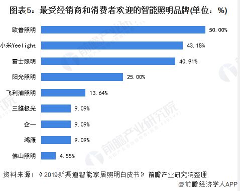 行業(yè)競(jìng)爭(zhēng)逐漸激烈 2011年國(guó)家發(fā)改委等五部委發(fā)布了“中國(guó)逐步淘汰白熾燈路線圖”,提出白熾燈淘汰步驟。隨后,2015年2月份,亞明、陽(yáng)光、鴻雁、歐普、飛利浦、木林森、科瑞、銳高、瑩輝、柏年、鼎暉、頓格等13家企業(yè)與結(jié)盟,簽訂了《共建智能照明聯(lián)合聲明》,抱團(tuán)推廣智能照明。另一邊,照明企業(yè)也在謀求和互聯(lián)網(wǎng)企業(yè)的合作。2016年,與華為開始戰(zhàn)略合作,并在華為HiLink智慧家庭生態(tài)發(fā)布會(huì)上發(fā)布了合作后的首批產(chǎn)品。智能也和鴻雁電器達(dá)成合作。 根據(jù)智哪兒、、雷士照明、昕諾飛、涂鴉智能、上海聯(lián)通、華藝廣場(chǎng)、億美光電等一線單位和近20家的相關(guān)企業(yè)聯(lián)合編制的《2019新渠道智能家居照明白皮書》顯示,目前中國(guó)主要的智能照明品牌有歐普照明、小米Yeelight、雷士照明、陽(yáng)光照明、飛利浦照明等,在《2019新渠道智能家居照明白皮書》調(diào)研中,上述品牌在“最受經(jīng)銷商和消費(fèi)者歡迎的智能照明品牌”選項(xiàng)中占比分別為50%、43.18%、40.91%、25%、13.64%。 此外,在智能家居照明領(lǐng)域,阿里、騰訊、小米、海爾等互聯(lián)網(wǎng)、家電企業(yè)也跨界而來(lái),開始照明設(shè)計(jì)和照明銷售,試圖打造自己的智能生態(tài)圈。