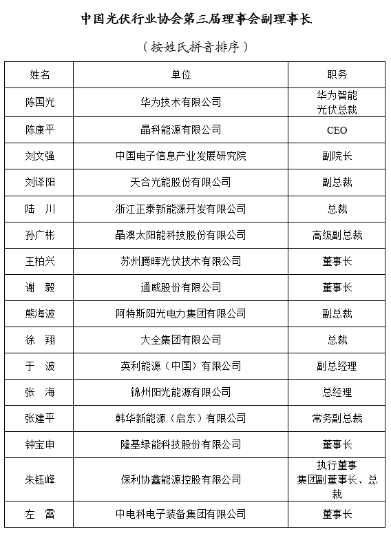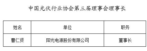 首先,會議通過投票,選舉了上海愛旭新能源股份有限公司董事長兼總經(jīng)理陳剛等44位企業(yè)代表為第三屆常務(wù)理事會常務(wù)理事。其次,會議通過投票,選舉陽光電源股份有限公司董事長曹仁賢先生擔(dān)任中國光伏行業(yè)協(xié)會第三屆理事長;選舉華為技術(shù)有限公司智能光伏總裁陳國光等16位企事業(yè)單位代表為中國光伏行業(yè)協(xié)會第三屆副理事長;選舉王世江為中國光伏行業(yè)協(xié)會秘書長。根據(jù)王世江秘書長的提名,決定劉譯陽、王亮、孫廣彬?yàn)楦泵貢L,劉譯陽為新聞發(fā)言人。
