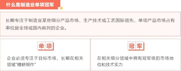 制造業(yè)單項冠軍旨在引導制造業(yè)企業(yè)專注創(chuàng)新和質(zhì)量提升,在更多細分產(chǎn)品領域形成全球市場、技術(shù)等方面領先的單項冠軍地位,提升我國制造業(yè)國際競爭力,促進我國產(chǎn)業(yè)整體在全球產(chǎn)業(yè)鏈中邁向高端。