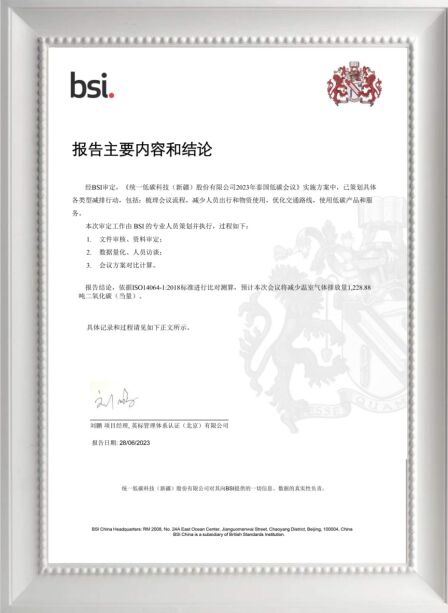 據(jù)介紹,為了保證低碳措施的有效性和科學(xué)性,統(tǒng)一委托BSI(英國標準協(xié)會)對會議實施方案進行了碳足跡認證。BSI是全球領(lǐng)先的標準制定、認證和培訓(xùn)機構(gòu),擁有豐富的碳管理經(jīng)驗和專業(yè)技術(shù)。經(jīng)BSI驗證,依據(jù)ISO14064-1:2018標準進行比對測算,認定統(tǒng)一低碳大會實施方案將減少溫室氣體排放量1,228.88噸二氧化碳(當量)。