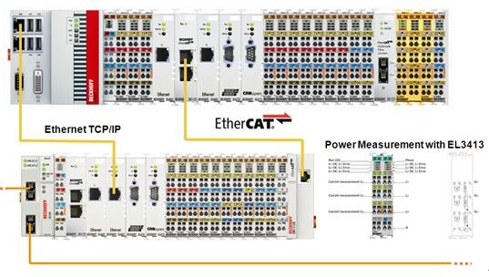 該方案采用了倍福嵌入式工業(yè) PC CX5020控制器作為風(fēng)機(jī)的主控制器,主控制程序基于TwinCAT軟件,運(yùn)用倍福自主開發(fā)完善、高效、成熟的風(fēng)電專用功能庫,集成先進(jìn)的控制算法,很好的協(xié)調(diào)控制風(fēng)機(jī)各部件和子系統(tǒng)的運(yùn)行。根據(jù)當(dāng)前的風(fēng)況和風(fēng)電場(chǎng)能量管理平臺(tái)的控制指令,控制風(fēng)機(jī)的輸出電壓、頻率和功率等等,保證風(fēng)機(jī)的穩(wěn)定運(yùn)行。 風(fēng)機(jī)控制器可以通過 EtherCAT網(wǎng)橋模塊EL6695和擴(kuò)展模塊EK1110 接入風(fēng)電場(chǎng)實(shí)時(shí)控制網(wǎng)絡(luò),與能量管理平臺(tái)進(jìn)行通訊,滿足對(duì)整個(gè)風(fēng)電場(chǎng)的實(shí)時(shí)控制的需要。EK1501作為單臺(tái)風(fēng)機(jī)與風(fēng)電場(chǎng)EtherCAT實(shí)時(shí)網(wǎng)絡(luò)的接入點(diǎn)。 EL3413 模塊可直接監(jiān)測(cè)單臺(tái)風(fēng)機(jī)并網(wǎng)側(cè)的690 V AC電壓、電流、頻率、有功、無功、發(fā)電量,以及21次以內(nèi)的諧波等等。風(fēng)機(jī)主控系統(tǒng)通過采集的電力數(shù)據(jù)監(jiān)測(cè)風(fēng)機(jī)運(yùn)行狀況、相關(guān)的數(shù)據(jù)可通過風(fēng)場(chǎng)網(wǎng)絡(luò)傳送到風(fēng)電場(chǎng)中控室的能量管理平臺(tái)和 SCADA系統(tǒng)。 b) 風(fēng)電場(chǎng)控制器及公共并網(wǎng)點(diǎn)電力監(jiān)測(cè),如下圖4所示