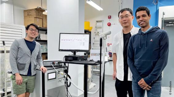 Breathonix 團(tuán)隊(duì)與 Ionicon 公司的 PTR-TOF 分析儀合影:新加坡研究人員使用專用的軟件處理新冠病毒呼氣檢測(cè)的分析數(shù)據(jù),一分鐘就能出結(jié)果。