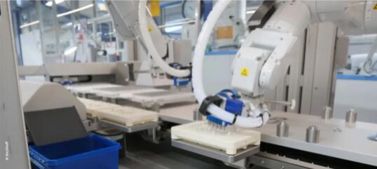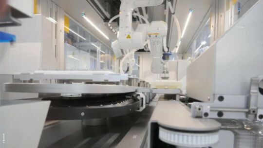 添加新的模塊后,這臺設(shè)備將來既能用散裝泡罩包裝組件,也能用帶紙板外包裝和已打印好的標(biāo)簽的泡罩包裝組件。這需要在設(shè)備中添加一個(gè)切紙裝置、一個(gè)用于紙箱坯料的料庫模塊和一個(gè)新的打印機(jī)模塊。紙盒包裝將于 2023 年夏天推出;在此之前,包裝將繼續(xù)采用散裝泡罩。Elos 還增加了兩個(gè)視覺模塊,用于檢查待包裝的物品以及標(biāo)簽的位置和內(nèi)容。在此之前,設(shè)備底座上安裝了兩個(gè)機(jī)器人。擴(kuò)展后,機(jī)器人可以在機(jī)器單元頂部的導(dǎo)軌上自由地來回移動(dòng),以騰出空間并執(zhí)行更多任務(wù)。