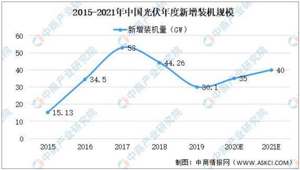 光伏行業(yè)是結(jié)合新能源發(fā)電與半導(dǎo)體技術(shù)的戰(zhàn)略性新興行業(yè),也是受到國家產(chǎn)業(yè)政策和財政政策重點支持的新能源行業(yè),光伏發(fā)電具有可持續(xù)性、清潔性和無地域限制等突出優(yōu)勢。 (一)發(fā)展?fàn)顩r (1)市場規(guī)模 2019年,受平價上網(wǎng)政策影響,全國光伏新增裝機(jī)量有所下滑,維持在30.1GW,較2018年下降31.97%。2020年在未建成的2019年競價項目、特高壓項目,以及新增競價項目、平價項目等拉動下,預(yù)計國內(nèi)新增光伏市場將實現(xiàn)恢復(fù)性增長,預(yù)計2020年全國新增裝機(jī)量將超過35GW,2021年將達(dá)到40GW。