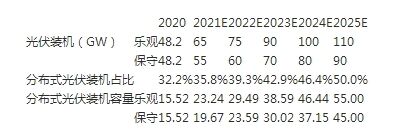 二、分布式光伏蘊(yùn)含萬億級(jí)的市場(chǎng)潛力 從后續(xù)光伏裝機(jī)容量的角度看,分布式光伏具有較大的上升空間。根據(jù)CPIA(中國光伏協(xié)會(huì))預(yù)測(cè),我國光伏新增裝機(jī)容量較“十三五”時(shí)期有望實(shí)現(xiàn)大幅增長(zhǎng),到2025年,我國光伏新增裝機(jī)容量有望達(dá)到90-110GW,2021-2025年新增光伏裝機(jī)量復(fù)合增長(zhǎng)率有望達(dá)到13.3%-13.7%。 十四五期間,分布式光伏電站有望迎來大幅增長(zhǎng)。我國2016年的能源十三五規(guī)劃中曾指出,到2020 年,太陽能發(fā)電規(guī)模達(dá)到 1.1 億千瓦以上,其中分布式光伏 6000 萬千瓦,占比達(dá)到55%。但從中國光伏協(xié)會(huì)公布的數(shù)據(jù)來看,2020年,我國集中式電站占比67.8%,分布式電站占比為 32.2%,分布式光伏電站的占比沒有達(dá)到十三五規(guī)劃的目標(biāo),預(yù)計(jì)十四五期間,分布式光伏將迎來較快發(fā)展。 據(jù)國家能源局公布數(shù)據(jù),2020年,我國新增光伏裝機(jī)量為48.20GW,其中集中式光伏為32.68GW、分布式光伏為15.52GW,分布式中戶用光伏 10.10GW、工商業(yè) 5.42GW,2020年分布式新增裝機(jī)容量重拾升勢(shì),同比增長(zhǎng)27.21%。 CPIA也預(yù)測(cè),未來我國分布式光伏電站的比例將呈上升趨勢(shì),樂觀情況下,到2025年,我國分布式光伏新增容量有望達(dá)到55GW,占比達(dá)到50%,其中工商業(yè)分布式為41.25GW,占分布式新增裝機(jī)容量的75%。 分布式光伏新增裝機(jī)容量預(yù)測(cè)