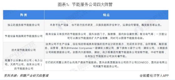 當前中國節(jié)能服務行業(yè)發(fā)展還存在較大的缺陷,首先是規(guī)模小、發(fā)展水平低、市場競爭激烈。其次發(fā)展區(qū)域不均衡,東部地區(qū)遙遙領先;最后是市場競爭出現(xiàn)同質(zhì)化。 未來節(jié)能服務企業(yè)應該在產(chǎn)業(yè)供應鏈方向上整合資源,優(yōu)勢互補,對具有產(chǎn)業(yè)優(yōu)勢的企業(yè),實現(xiàn)兼并聯(lián)合,實現(xiàn)其產(chǎn)業(yè)優(yōu)勢的快速擴張,從而提升企業(yè)應對市場的能力。 節(jié)能服務公司四大陣營,節(jié)能設備制造商的節(jié)能服務公司有較大優(yōu)勢 行業(yè)現(xiàn)狀來看,目前中國節(jié)能服務企業(yè)存在規(guī)模小、發(fā)展水平低,市場競爭激烈、整體的生存狀況較為惡劣的局面。未來在“互聯(lián)網(wǎng)++”戰(zhàn)略全面推薦的時代背景下,城市建設、園區(qū)建設將會更加注重以移動互聯(lián)網(wǎng)、物聯(lián)網(wǎng)、云計算、大數(shù)據(jù)等為代表的信息技術與城市及園區(qū)發(fā)展融合應用。在產(chǎn)城融合的發(fā)展趨勢下,節(jié)能服務公司應該有所探索和嘗試,為向智慧化發(fā)展提供思路。分析認為,節(jié)能服務公司大體可以分為四大陣營,如下表所示: