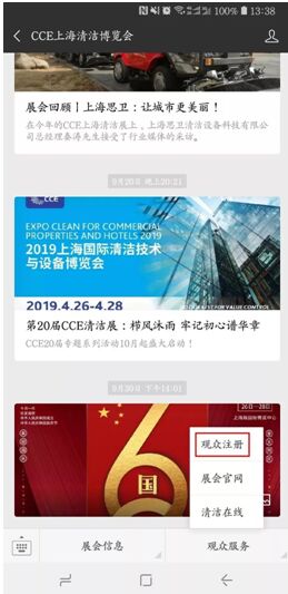 亞洲清潔行業(yè)旗艦展——2019上海國(guó)際清潔技術(shù)與設(shè)備博覽會(huì)觀眾注冊(cè)系統(tǒng)于2018年10月17日正式上線,提前預(yù)登記即可免費(fèi)免排隊(duì)入場(chǎng)!     2019上海國(guó)際清潔技術(shù)與設(shè)備博覽會(huì)觀眾預(yù)登記開啟后,電腦端用戶可以登錄展會(huì)官方網(wǎng)站:www.chinacleanexpo.com,移動(dòng)端用戶可以通過(guò)展會(huì)官方微信:CCE上海清潔博覽會(huì),點(diǎn)擊首頁(yè)“觀眾登記”完成觀眾注冊(cè),不僅可免費(fèi)免排隊(duì)入場(chǎng),同時(shí),到場(chǎng)更有好禮相送!