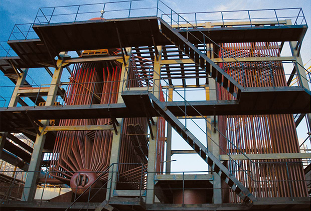 該型鍋爐結構布置簡單、緊湊。鍋爐本體由燃燒設備、給煤裝置、布風系統、高溫旋風分離器、對流管束、省煤器、空氣預熱器、鋼架、扶梯、爐墻等組成。爐膛由水冷壁構成,可在較短時間內啟、停鍋爐。該鍋爐具有一定的負荷調節(jié)能力,自動化程度高,產品運行穩(wěn)定。該鍋爐具有高效、節(jié)能、環(huán)保等特點該型鍋爐采用床上木柴、木炭點火方式。采用高溫旋風分離器裝置,分離裝置布置在爐膛出口,分離器入口煙溫850-950℃。在分離器下部布置了返料裝置。分離器下來的飛灰經返料裝置送回爐膛繼續(xù)燃燒。經過分離器分離的煙氣從分離出口筒向上流經水平煙道進入尾部煙道加熱尾部受熱面。該型鍋爐采用流化床燃燒技術,煤種適應性廣,可燃用無煙煤、煙煤、褐煤、貧煤、煙矸石等。采用低溫燃燒并可進行爐內脫硫處理,有利于環(huán)境保護,符合國家的環(huán)境保護政策。